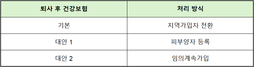 퇴사 후 가족의 건강보험에 피부양자로 등록할 수도 있습니다.