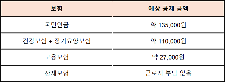 따라서 월급 300만원 기준으로 약 27만원 정도가 4대보험으로 공제됩니다.