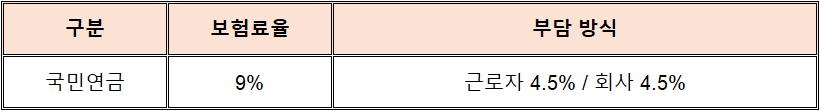 - 국민연금 → 회사 50% + 근로자 50%