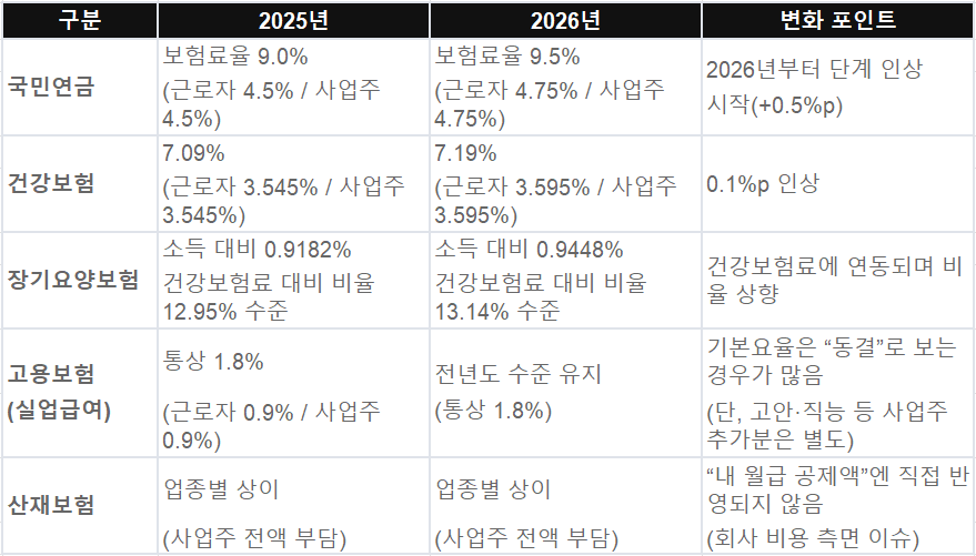 핵심만 먼저: 직장인 기준(보험료율만 기준)으로는 대체로 국민연금 +0.5%p, 건강보험 +0.1%p, 장기요양 비율 상향이 체감 포인트입니다.