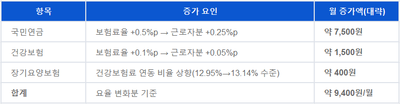 같은 방식으로 계산하면 월 500만원 기준(요율 변화분만) 근로자 부담은 약 15,700원/월 수준으로 증가할 수 있습니다.